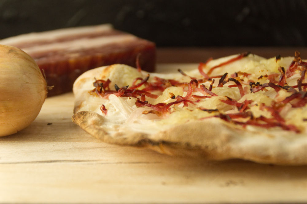 - Zutatenliste: Mehl, Wasser, Zwiebeln, geräucherter Schinken, Creme Fraiche